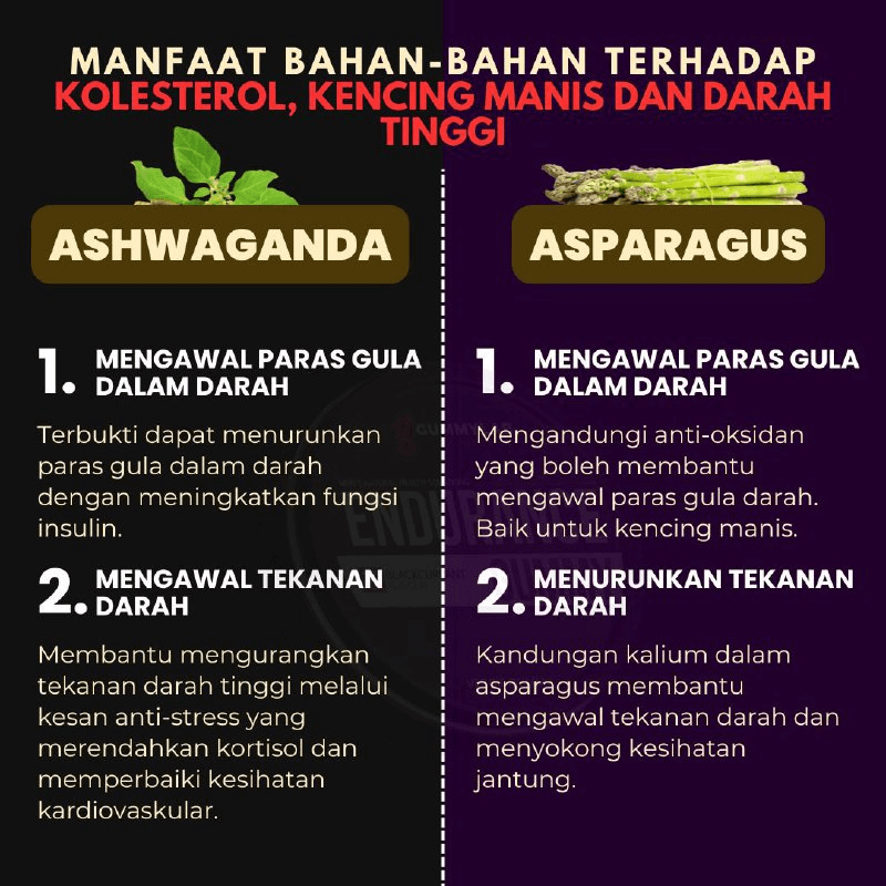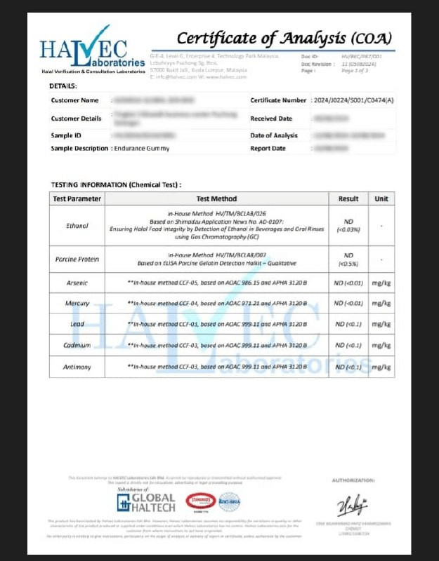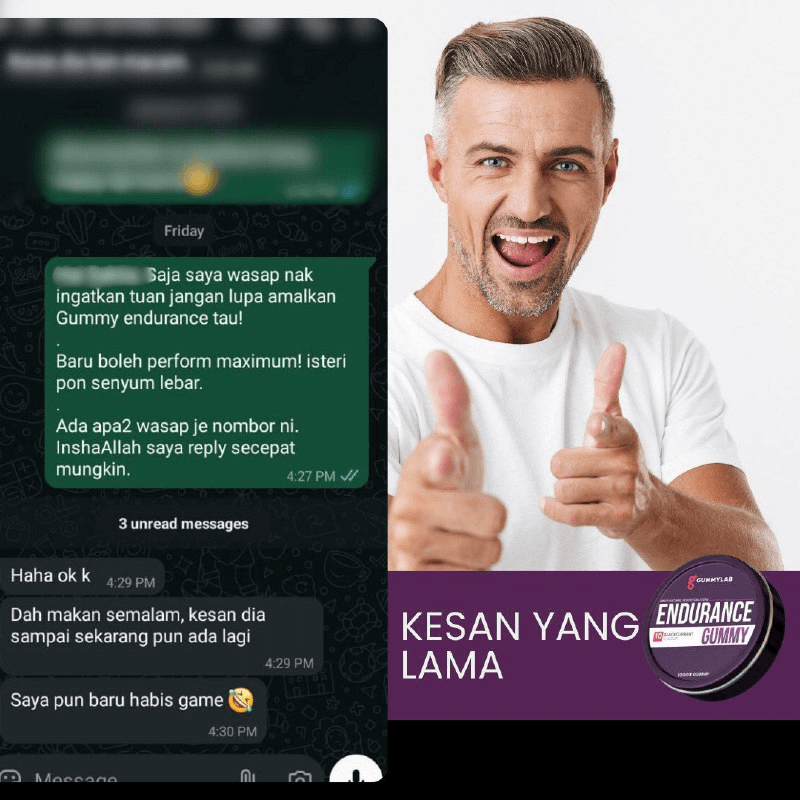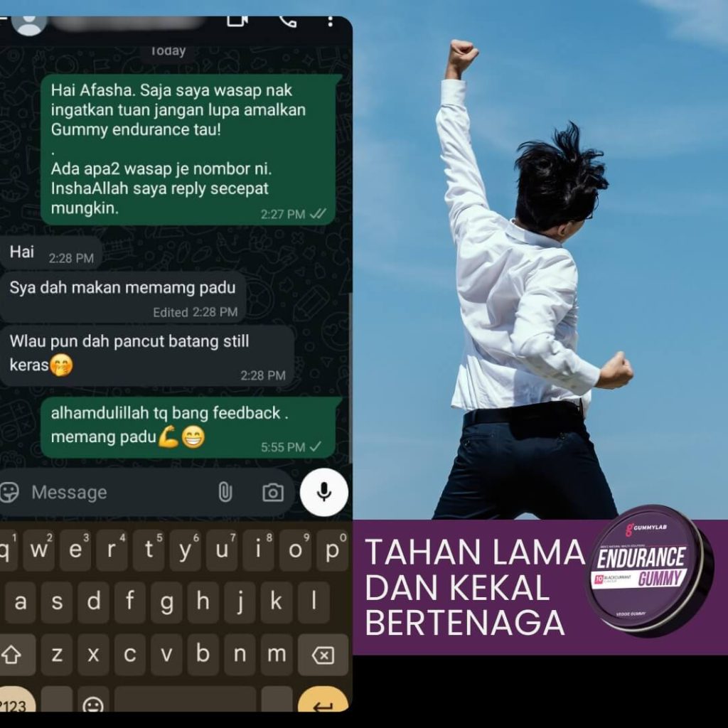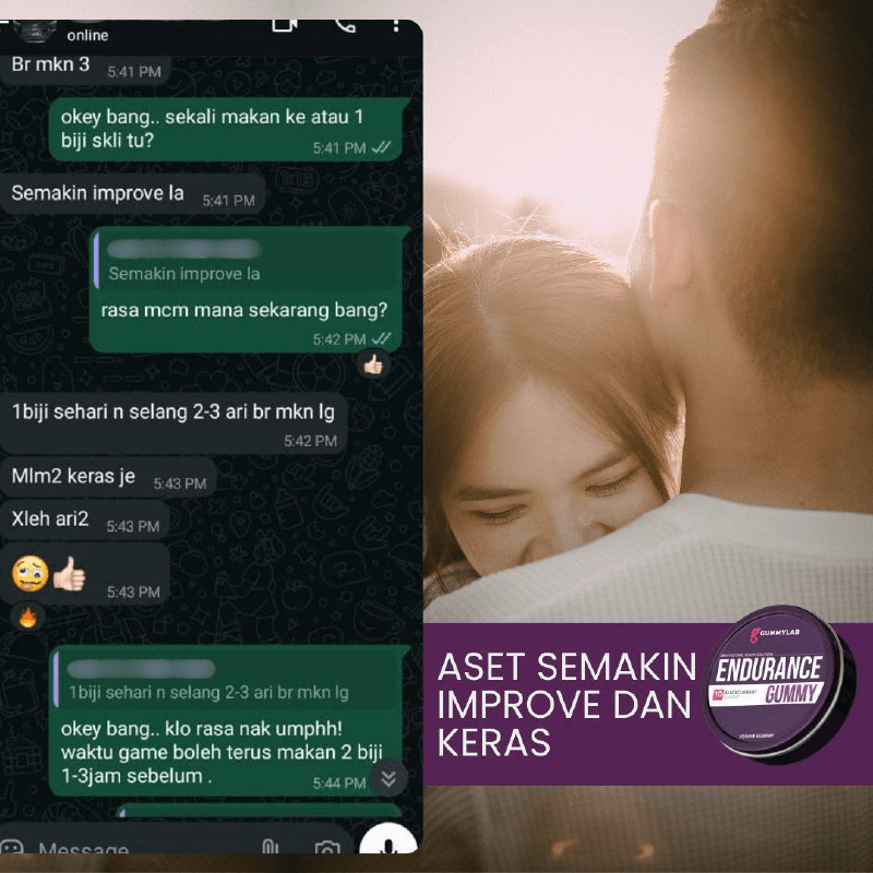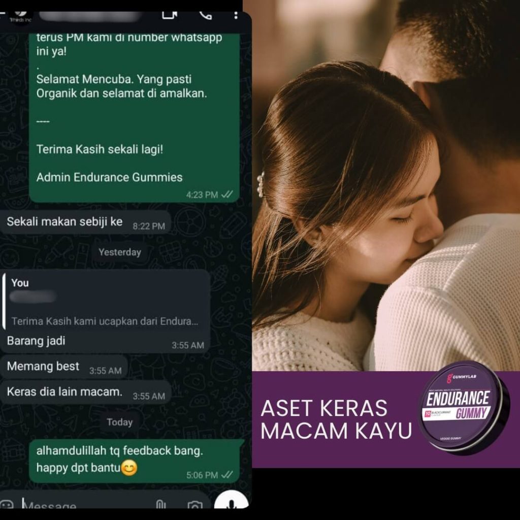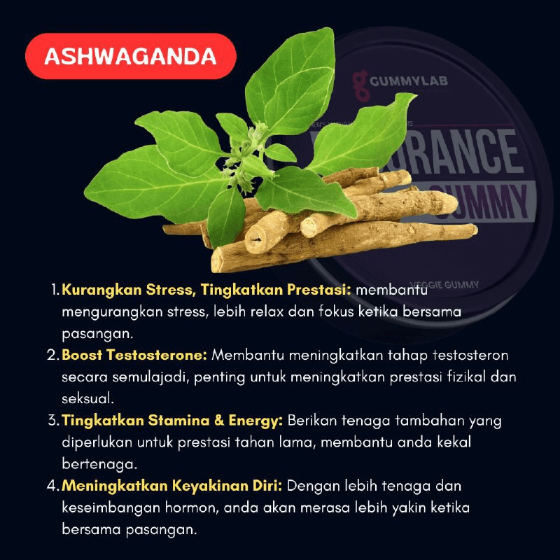 Jangan bimbang. Gummy Endurance bukan sekadar supplement biasa.Diformulasikan dengan bahan semulajadi berkualiti tinggi seperti Asparagus, Shilajit, Ashwagandha, dan Tribulus yang terbukti membantu meningkatkan stamina dan tenaga secara berkesan dalam masa singkat. Disahkan Halal dan selamat digunakan tanpa kesan sampingan. Ramai suami dah rasai perbezaannya, dan kini giliran tuan pula untuk alami perubahan sebenar dalam hubungan!