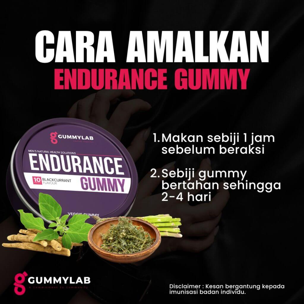 Gummy Endurance sangat mudah diambil. Cukup kunyah satu gummy setiap 3 hari untuk merasakan perbezaannya. Bentuk gummy ini membuatkan pengambilan suplemen lebih mudah dan sedap untuk dimakan.